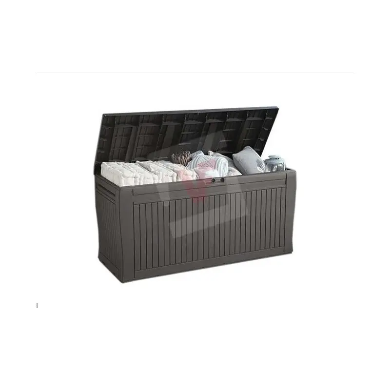 Baule porta attrezzi da usare in giardino o in garage. Modello KETER in robusto materiale in resina. Grazie al suo materiale di produzione il cassone in plastica è molto resistente a qualsiasi agente atmosferico ed è utile per riporre qualsiasi tipo di materiale da giardino o materiale tipo cuscini per i divanetti esterni oppure attrezzi per il giardino o qualsiasi materiale da campeggio. Si può usare anche come comoda seduta da giardino grazie alla sua grande resistenza e al suo coperchio adatto ai carichi. Facile da trasportare grazie alle sue impugnature incassate e alle sue rotelle integrate nella parte sottostante. La sua capacità è di 270 litri e le sue misure sono cm 116,7 x 44,7. La sua altezza è di 57 cm. Si può chiudere con un lucchetto e per l'aerazione sono presente delle griglie per il passaggio dell'aria. Si monta facilmente in 5 minuti