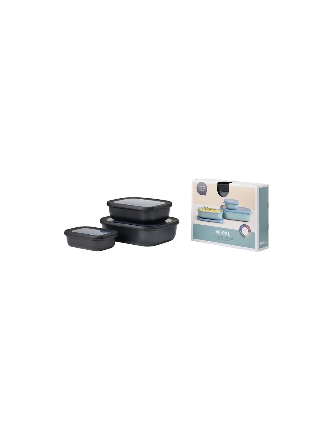 Set di contenitori per alimentari composto da ciotole multiple Cirqula di forma rettangolare dell'azienda Mepal. Set da 3 pezzi composto da 3 ciotole dalla portata di 500 ml, 1000 ml e 2000 ml. Le ciotole per alimenti Cirqula si possono utilizzare per conservare, congelare e riscaldare il cibo nel microonde. Grazie alla sua forma rettangolare che ottimizza lo spazio ora puoi conservare i tuoi alimenti nel frigorifero e nel congelatore. Le ciotole per prodotti alimentari sono realizzate in materiale infrangibile. Il coperchio ermetico e a tenuta di aroma consente di vedere il prodotto all'interno del contenitore senza dover aprire il coperchio e alterare l'alimento grazie alla sua finestra di visualizzazione. Grazie a questo saprai sempre quali sono gli alimenti che hai a disposizione. Dopo l'uso, le ciotole si possono tranquillamente lavare in lavastoviglie e poi impilate una dentro l'altra con il coperchio per risparmiare spazio. Il coperchio non è adatto al microonde.