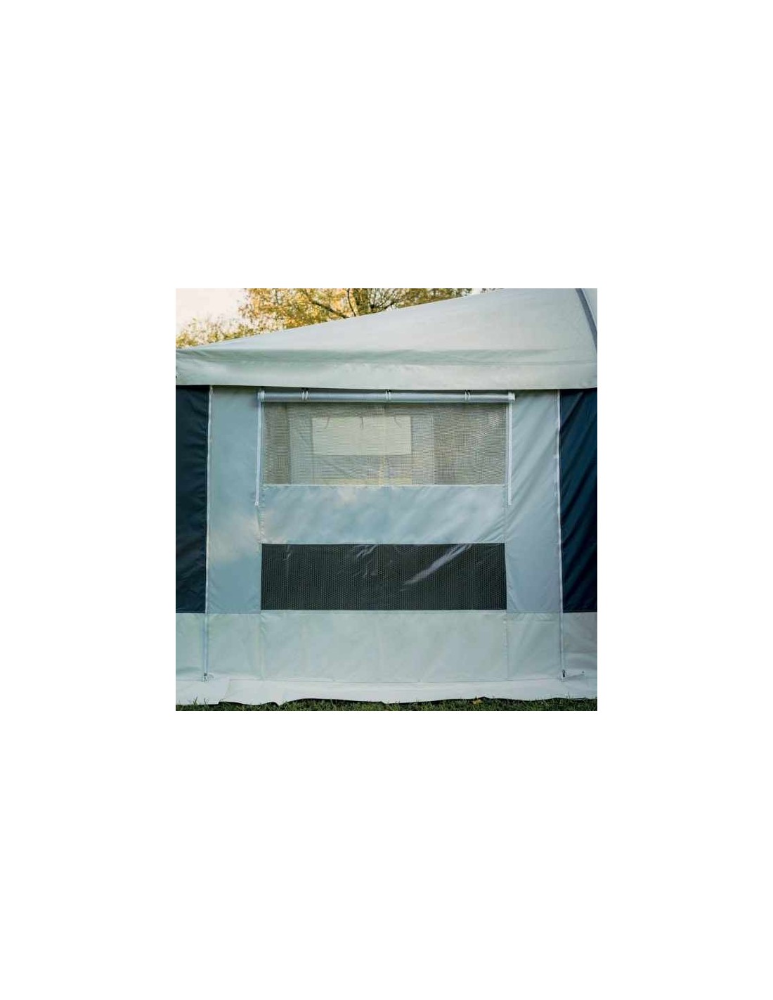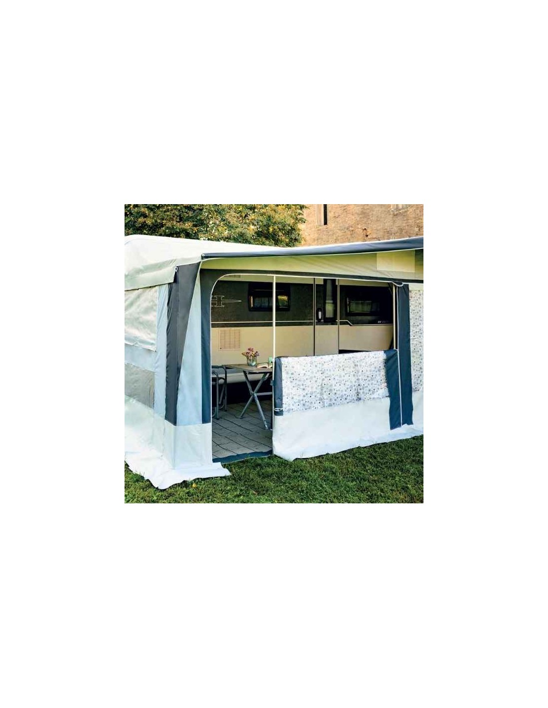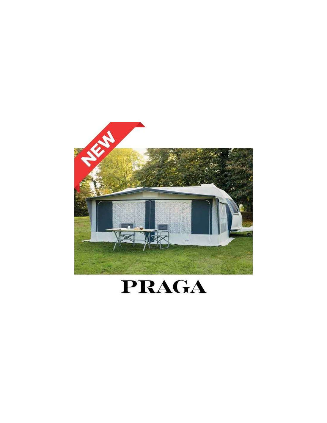 Veranda CONVER modello Praga novità del 2026 realizzata per chi fa campeggio stanziale in semplicità. Tetto in tessuto poliestere bispalmato PVC da 530 gr/mq di colore grigio di duraturo nel tempo e facile da pulire, con paleria in alluminio con un diametro di 26 mm x 1,5 mm di spessore. Classica veranda della LINEA CLASSIC molto ariosa e illuminata grazie alle sue ampie finestre frontali. Nella parte frontale amovibile, trovate 2 pannelli con ingresso alle estremità laterali nella parte destra e sinistra con finestra in cristal. Nelle pareti laterali, sempre abbattibili e asportabili, troverete una finestra con zanzariera e copertura di protezione in cristal incernierato. Per il montaggio trovate un cavetto termosaldato facile da inserire alla guida del perimetro della roulotte. Protezione sulle cerniere esposte all’acqua e balza perimetrale nel fondo in tessuto poliestere bispalmato PVC con ancorette in plastica porta elastico per tensionare bene la vostra veranda per caravan PRAGA durante il montaggio.