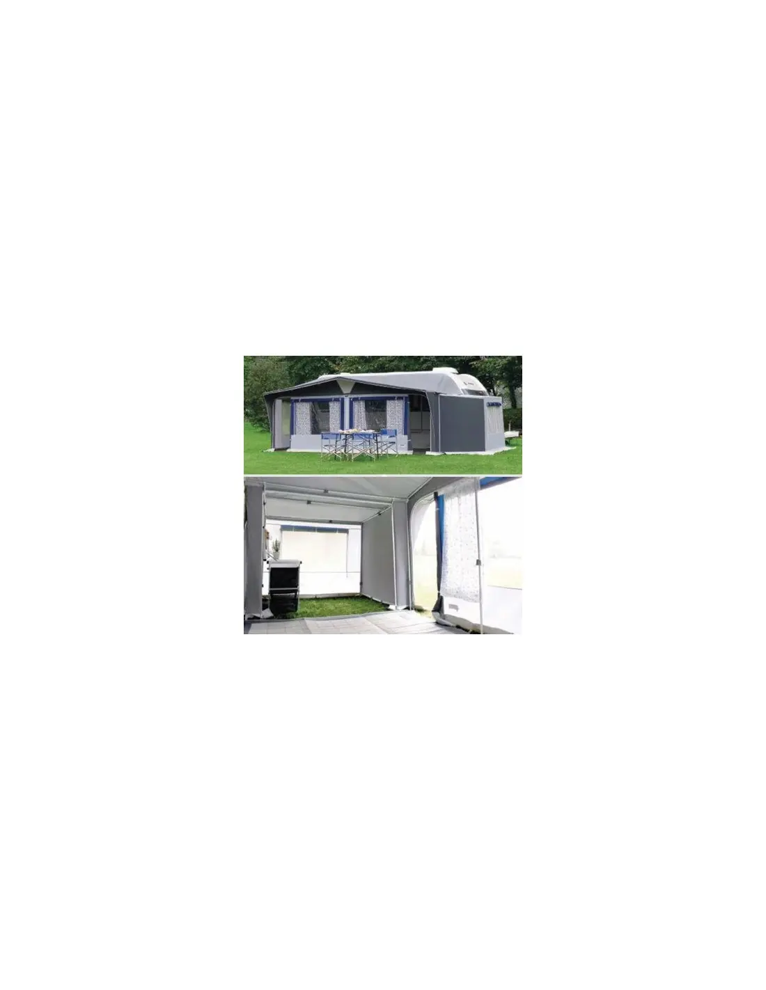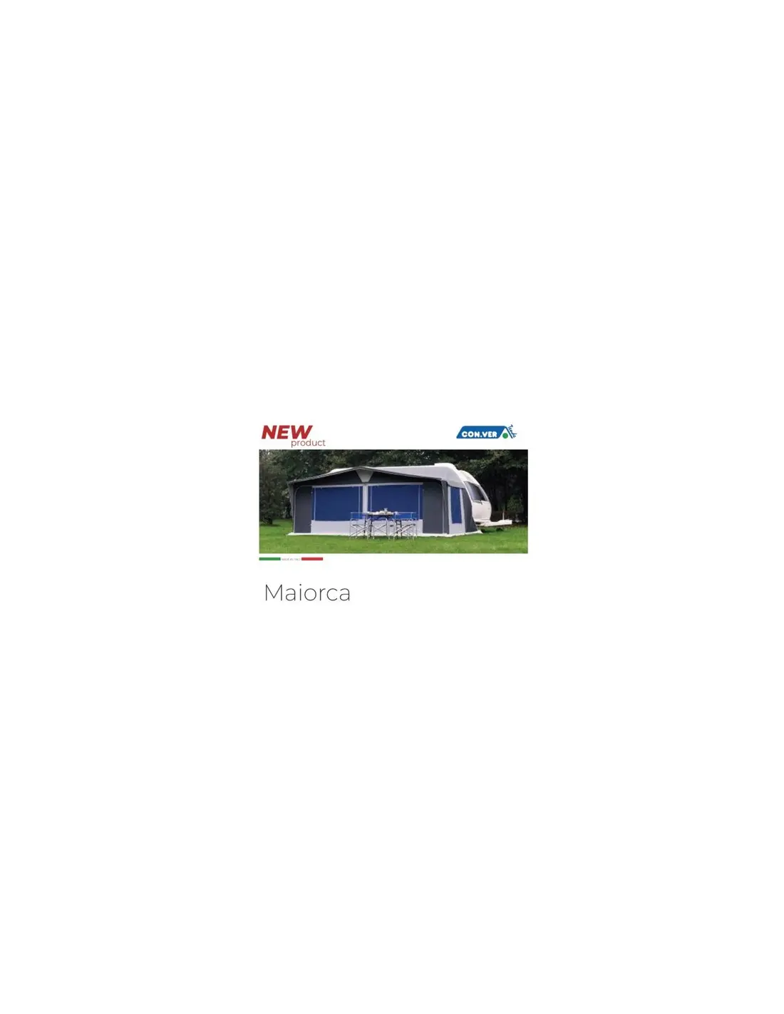 Veranda CONVER modello Maiorca novità dell'anno 2025 prodotta con tetto in tessuto poliestere bispalmato PVC da 530 gr/mq di colore grigio di duraturo nel tempo e facile da pulire, con paleria in alluminio con un diametro di 26 mm x 1,5 mm di spessore. Modello moderno molto luminosa con ampie finestre tra le più grande della linea CON.VER. Tutte le finestre di questa veranda sono dotate di oscurante. Finestre in cristal nella parte frontale con porta disegnata in maniera curva nei lati destro o sinistro. Le finestre sono in cristal trasparente senza righe con oscuranti in tencate con cerniera per una buona ed efficace chiusura. Le pareti frontali non sono intercambiabili visto il loro design rotondeggiante. Pareti laterali, sempre abbattibili e asportabili, con ampia zanzariera per un buon passaggio di aria che consente una buona permanenza al suo interno anche nei periodi più caldi. La finestra in zanzariera sarà sempre possibile la chiusura tramite l'oscurante sempre incernierato. Per il montaggio trovate un cavetto termosaldato facile da inserire alla guida del perimetro della roulotte. Protezione sulle cerniere esposte all’acqua e balza perimetrale nel fondo in tessuto poliestere bispalmato PVC con ancorette in plastica porta elastico per tensionare bene la vostra veranda per caravan MAIORCA durante il montaggio.