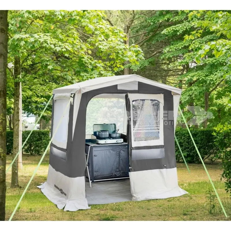 Cucinotto campeggio completo di finestre con zanzariera e copertura in plastica il cucinino da campeggio e completato nella parte inferiore con una balza perimetrale per impedire l'entrata di insetti. Il cucinotto da campeggio Gusto NG, è dotato di una porta ingrandita con finestre supplementari per creare una cucina campeggio bene illuminata. Il cucinotto in oggetto è completo di una sacca per la custodia della paleria e dotato di tutti gli accessori di montaggio. La cucina campeggio è disponibile anche in altri colori.