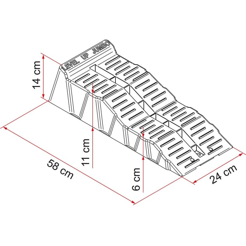 LEVEL UP - KIT LEVEL UP JUMBO sono i cunei camper Fiamma con una portata maggiore rispetto allo standard. La superficie dentellata a due livelli ha un migliore appoggio sulla gomma e facilita la presa sulle ruote del camper o della roulotte. Disegnato per un'altezza a due livelli. Molto leggero è prodotto in materiale resistente anticorrosione e facile da pulire. Nella confezione trovate 2 pezzi. La versione Kit Level Up JUMBO è completa di borsa Level Bag. Colore: grigio.