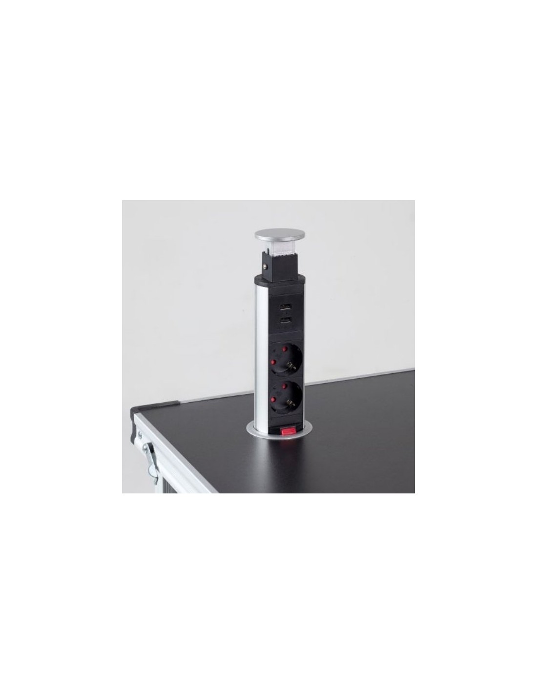 Si installa all’interno dell’armadietto e si estrae verso l’alto solo quando serve, offrendo 2 prese Schuko e 2 porte USB di ricarica.