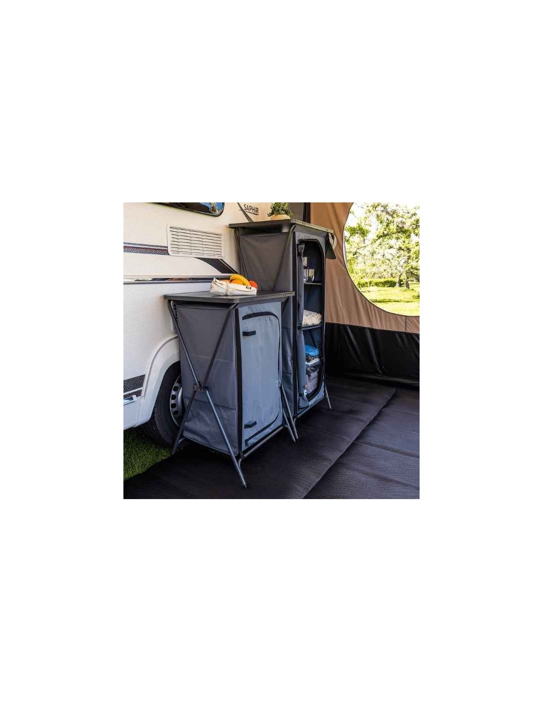 L'armadio da campeggio Toledo High di Travellife è un mobiletto da campeggio pieghevole e versatile, con 4 scomparti e bastone appendiabiti.
