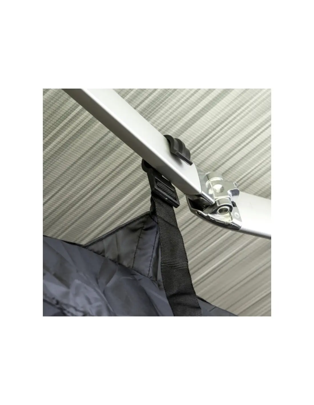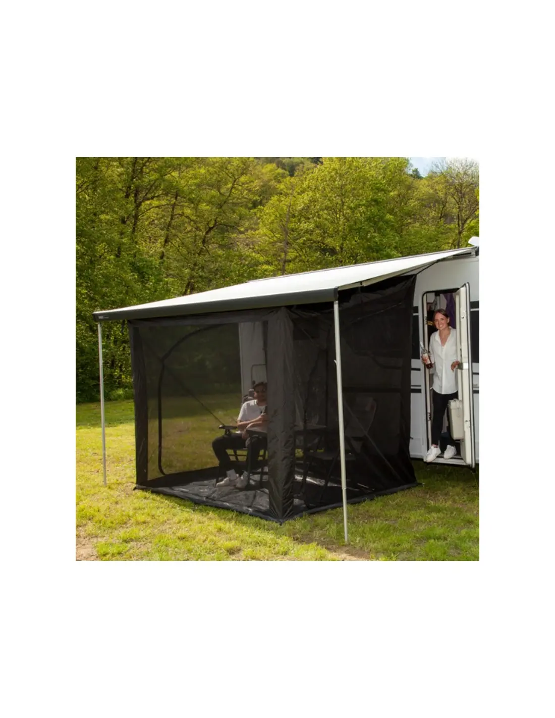 La tenda zanzariera da installare sotto al tendalino del camper o di una roulotte, si aggancia semplicemente ai bracci della tenda da sole quando è aperta con dei ganci come nella foto del dettaglio e crea un ambiente protetto dall'attacco di fastidiose insetti come zanzare, mosche, vespe e altri. Nella versione premium in dotazione di un pavimento cucito.