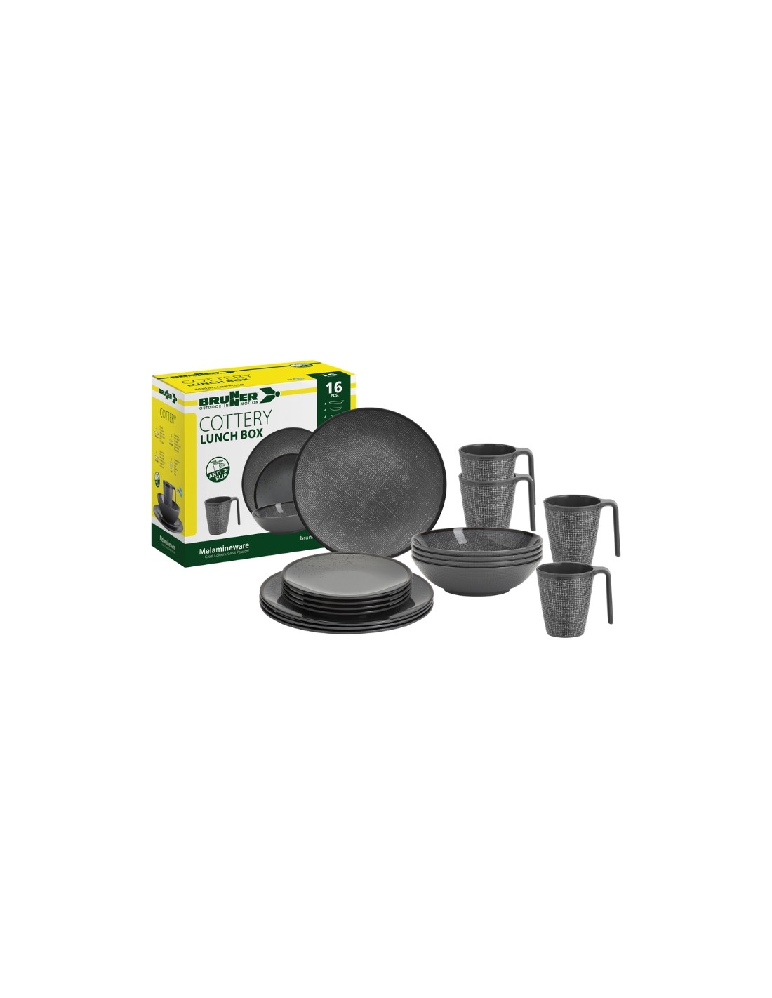 Confezione completo da 16 pezzi del set stoviglie da campeggio modello COTTERY. Il set piatti in melanina ha il sistema ANTI SLIP e si può lavare in lavastoviglie. Colore antracite marmorizzato, questo completo di piatti in plastica renderà la vostra tavola elegante e moderna.