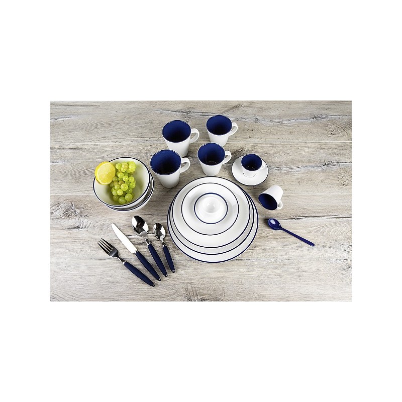 Piatti di melamina da utilizzare per chi viaggia in camper o come stoviglie in melamina per barca. Molto leggeri e facili da immagazzinare, questo set di stoviglie per campeggio è composto da 4 piatti piani Ø 25,5 cm, 4 piatti da dessert Ø 21 cm, 4 piatti fondi Ø 23 cm e 4 tazze con manico da 300 ml. Il colore di queste stoviglie da campeggio è blue e bianco. Questi piatti da campeggio, possono essere lavati in lavastoviglie ma non sono adatti all'uso per riscaldare in microonde. Il set stoglie in melamina può essere trasportato con il suo sacco incluso nella confezione.
