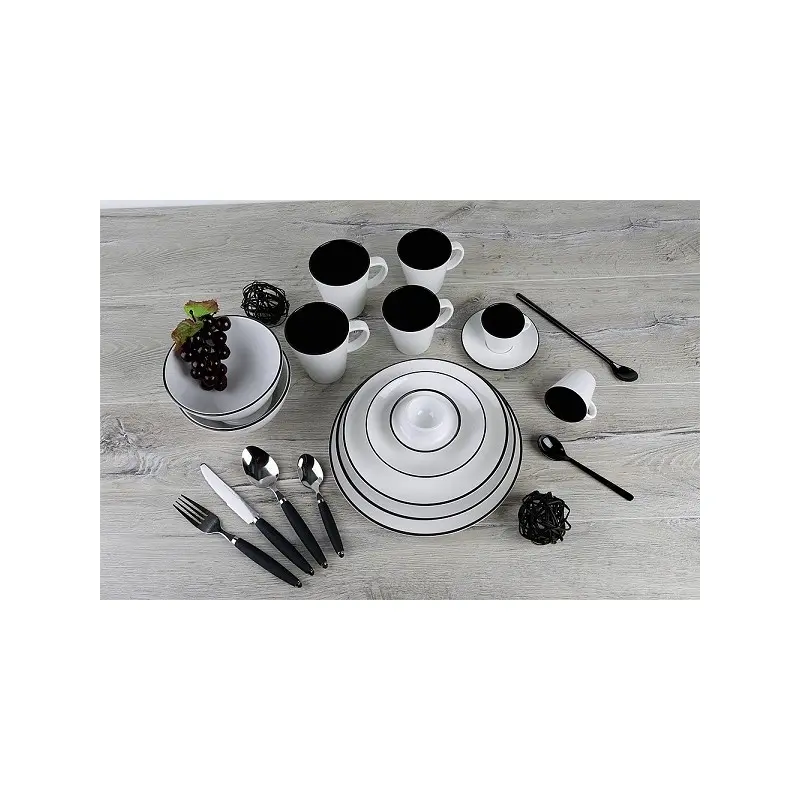 Piatti di melamina da utilizzare per chi viaggia in camper o come stoviglie in melamina per barca. Molto leggeri e facili da immagazzinare, questo set di stoviglie per campeggio è composto da 4 piatti piani Ø 25,5 cm, 4 piatti da dessert Ø 21 cm, 4 piatti fondi Ø 23 cm e 4 tazze con manico da 300 ml. Il colore di queste stoviglie da campeggio è nero e bianco. Questi piatti da campeggio, possono essere lavati in lavastoviglie ma non sono adatti all'uso per riscaldare in microonde. Il set stoglie in melamina può essere trasportato con il suo sacco incluso nella confezione.