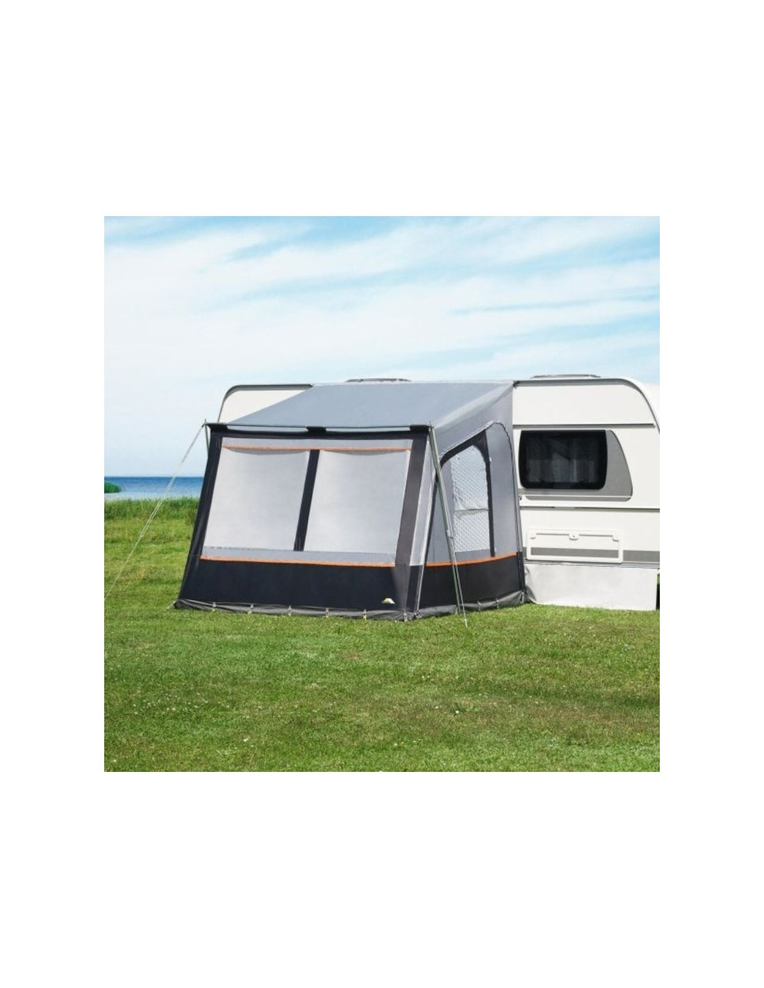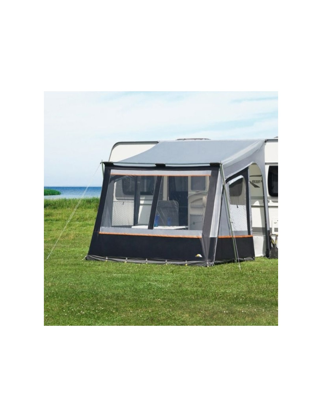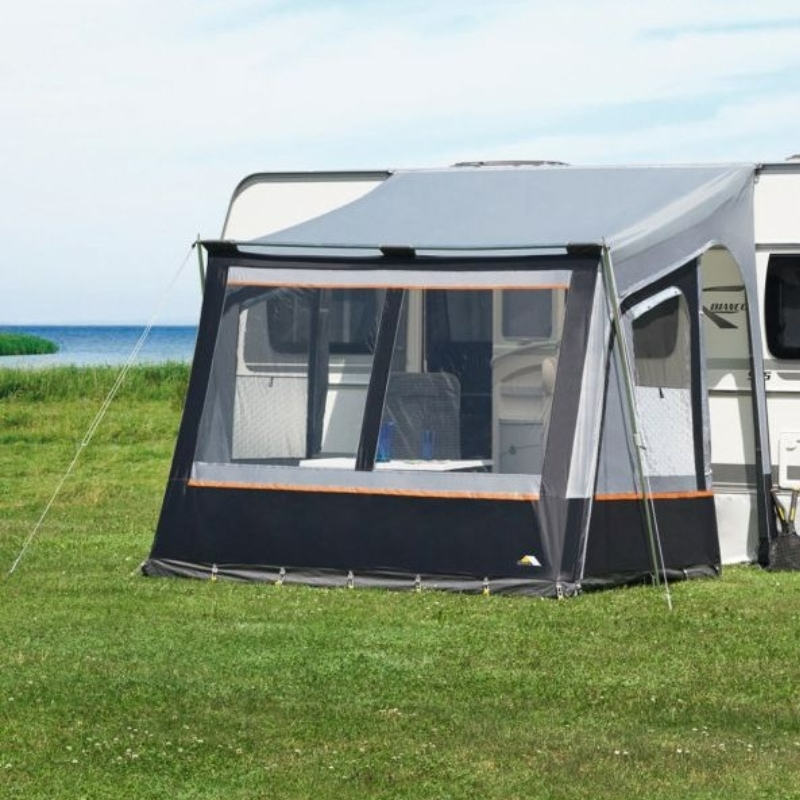 Pratica veranda per roulotte in poliestere OXFORD 150D, Fortuna è tra le tende per roulotte che proponiamo più pratiche e veloci da montare. Per questa veranda roulotte il montaggio avrà bisogno solo di tre pali per dare, velocità semplicità e poco peso fanno di questa veranda caravan la sua forza. Abbiamo cercato tra vari modelli di verande per roulotte e FORTUNA II con le sue cuciture saldate si evidenzia tra le tende per caravan come una tra le più performanti. Sufficienti opzioni di rinforzo adatte contro temporali o vento. Leggera veranda per caravan, Fortune II è prodotta per essere molto luminosa e spaziosa, grazie alla sua parete anteriore con ampia finestra in pellicola trasparente. Le tende cucite nella parte interna chiudono le finestre in modo opaco e creano una privacy ideale per chi ama la libertà del campeggio ma allo stesso tempo desidera avere nella veranda x roulotte un pò di intimità. Come in altre verande roulotte le pareti laterali presentano un ampia finestra di ventilazione ½ zanzariera e ½ lamina; rimovibile; con patta in lamina goffrata e porta che si raggruppa in maniera elegante lateralmente, le cerniere sono coperte per protezione dall'acqua della pioggia. Disponibili come optional salsicciotti di schiuma ad alto volume e aste di pressione.