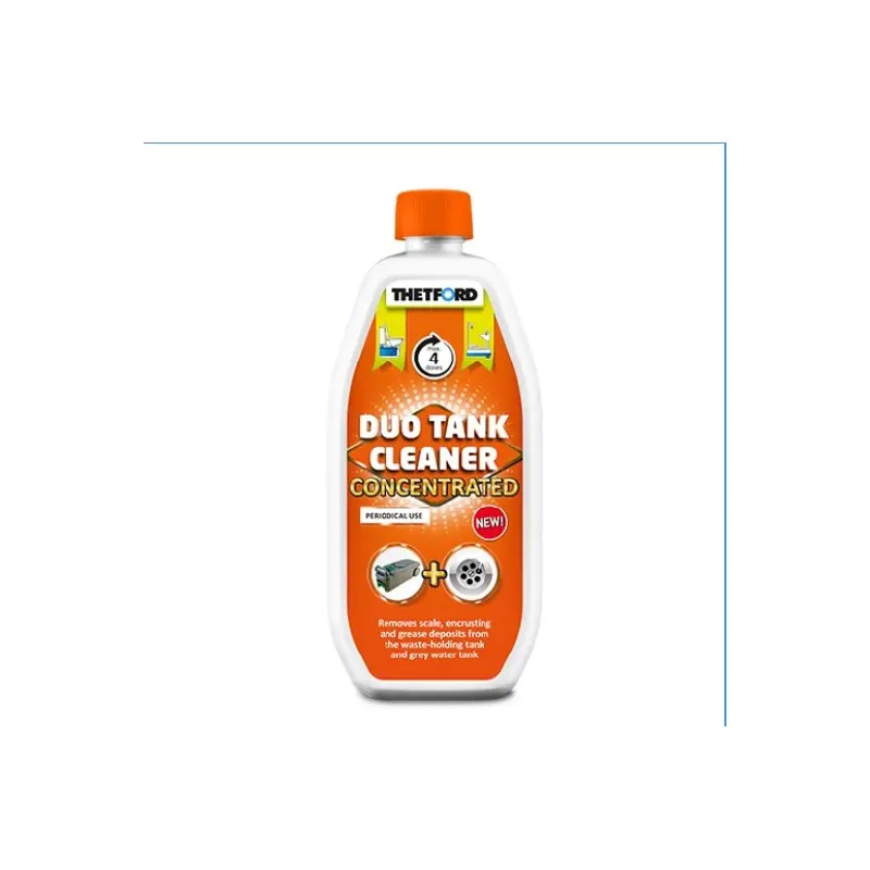 Il prodotto Duo Tank Cleaner Concentrated è uno dei nuovi prodotti per la pulizia concentrati distribuiti dalla famosa azienda Thetford. Prodotto per la pulizia del serbatoio delle acque nere e grigie è un potente liquido concentrato per la vostra pulizia periodica. Ottimo per rendere meno sgradevoli e sempre puliti i vostri serbatoi e dargli una lunga durata. Prodotto ideale per rimuovere il calcare o le fastidiose incrostazioni che si formano all'interno del serbatoio ed elimina i depositi di grassi. Tutte le parti tecniche interne con l'utilizzo di questo prodotto vengono pulite e soprattutto vengono ridotti i problemi di usura. Duo Tank allunga la durata del vostro serbatoio. Non è necessario strofinare a fondo e lo sporco e le incrostazioni si tolgono facilmente.