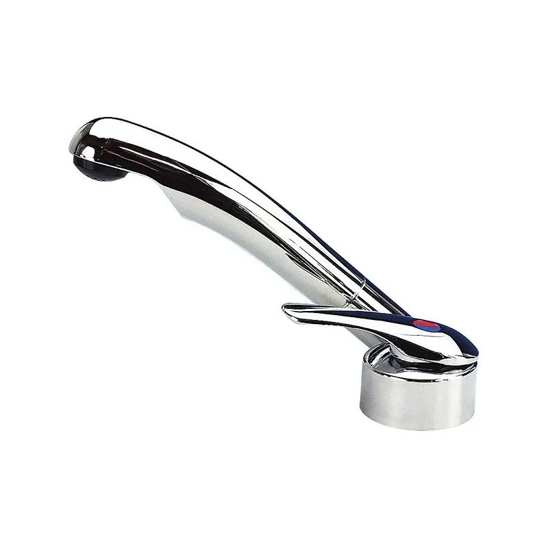 Miscelatore per cucina camper con ripiano richiudibile in vetro. Grazie alla sua misura contenuta in altezza occupa poco spazio e non crea problemi per la chiusura del ripiano. Miscelatore monocomando Samba con cartuccia ceramica e interruttore stagno.