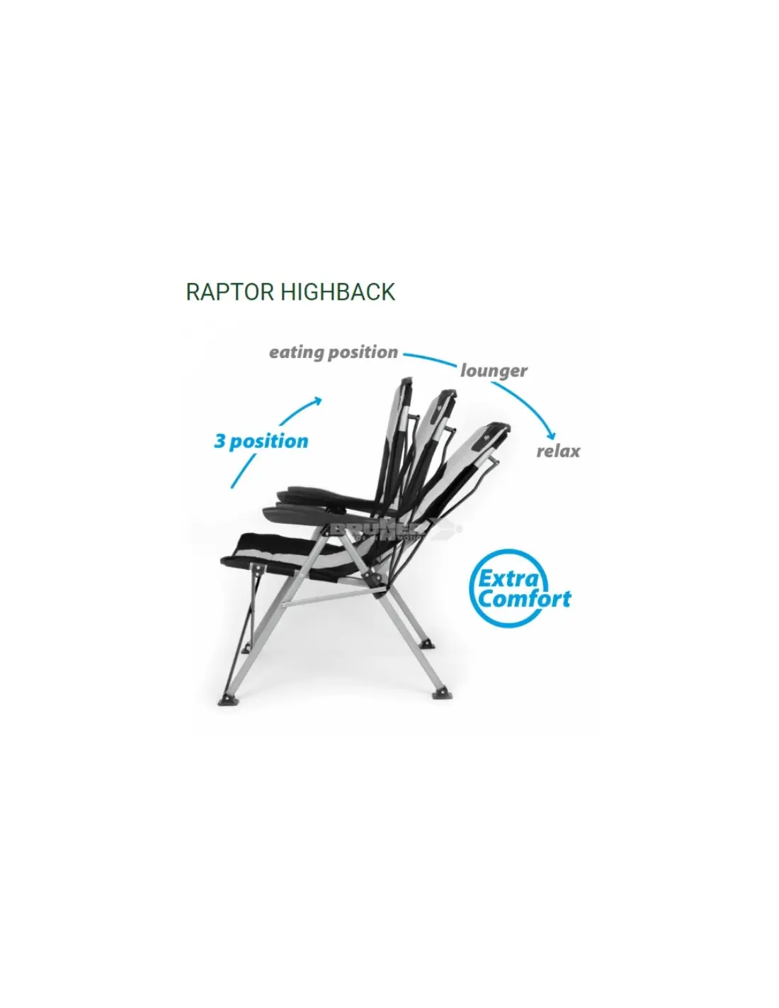 Nuova sedia Brunner Raptor HIGHBACK studiata con una struttura che mantiene dimensioni minime di ingombro ma con uno schienale più alto di circa 20 cm rispetto alle RAPTOR standard. Sedia pieghevole da campeggio che garantisce il minimo ingombro una volta chiusa e riposta, ideale per chi viaggia in camper o con roulotte. Questo però non preclude un alto livello di confort che normalmente tutte la collezione di sedie Raptor ci ha abituato. Prodotta con telaio in acciaio verniciato a polvere e telo portante in robusto tessuto di poliestere spalmato è una sedia resistente con una portata di 120 kg con dei comodi braccioli in plastica robusti, che danno una sensazione di comodità grazie al suo telaio in 4 gambe. Molto leggera pesa solo 6 Kg e una volta chiusa occupa uno spazio di diametro di soli 20 centimetri. Inclusa la sua sacca per il trasporto.