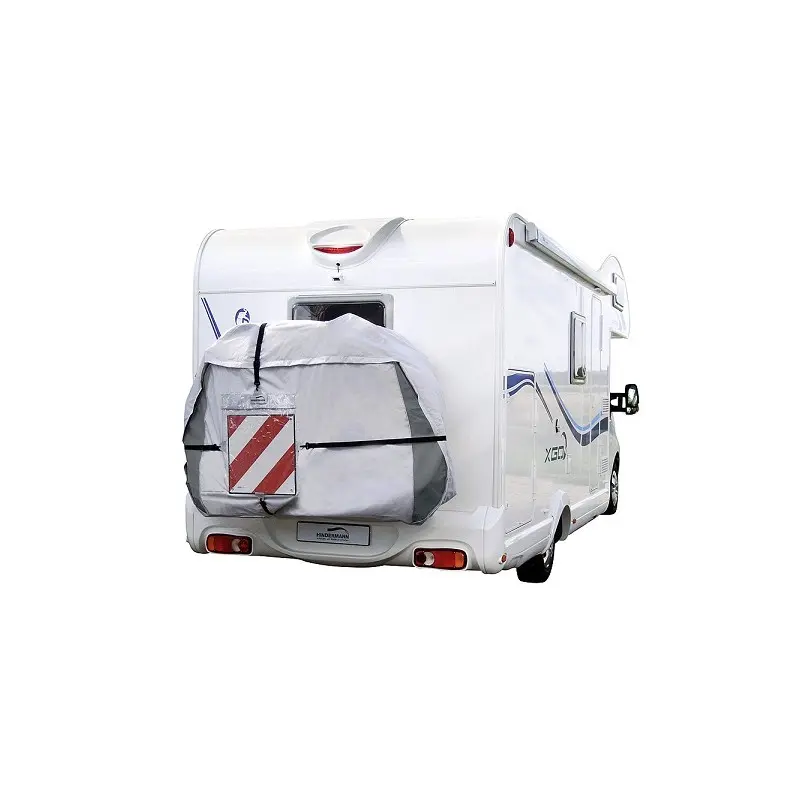 Copertura per e bike da camper o caravan completamente chiusa in cui sono protetti il portabiciclette e anche le ruote. Sulla parete del fondo sono presenti tre cerniere ad altezze diverse per le staffe di contenimento. È possibile grazie al suo sistema in cui è stato prodotto questo copribici, l'adattamento a qualsiasi tipo di veicolo ricreativo. Inoltre, la copertura può essere fissata con sicurezza nella parte esterna con varie cinghie di tensione. Nella sua grande tasca in materiale plastico trasparente si può facilmente inserire il cartello di carichi sporgenti obbligatorio epr norma del codice della strada. Si consiglia di prestare molta attenzione al fissaggio delle ebike. Tutte le cerniere sono facilmente accessibili. Montaggio facile e conveniente in piedi davanti al trasportino. L'illustrazione mostra gli accessori opzionali. Il telo copertura bicicletta serve anche a non sporcare le bici durante i vostri viaggi.