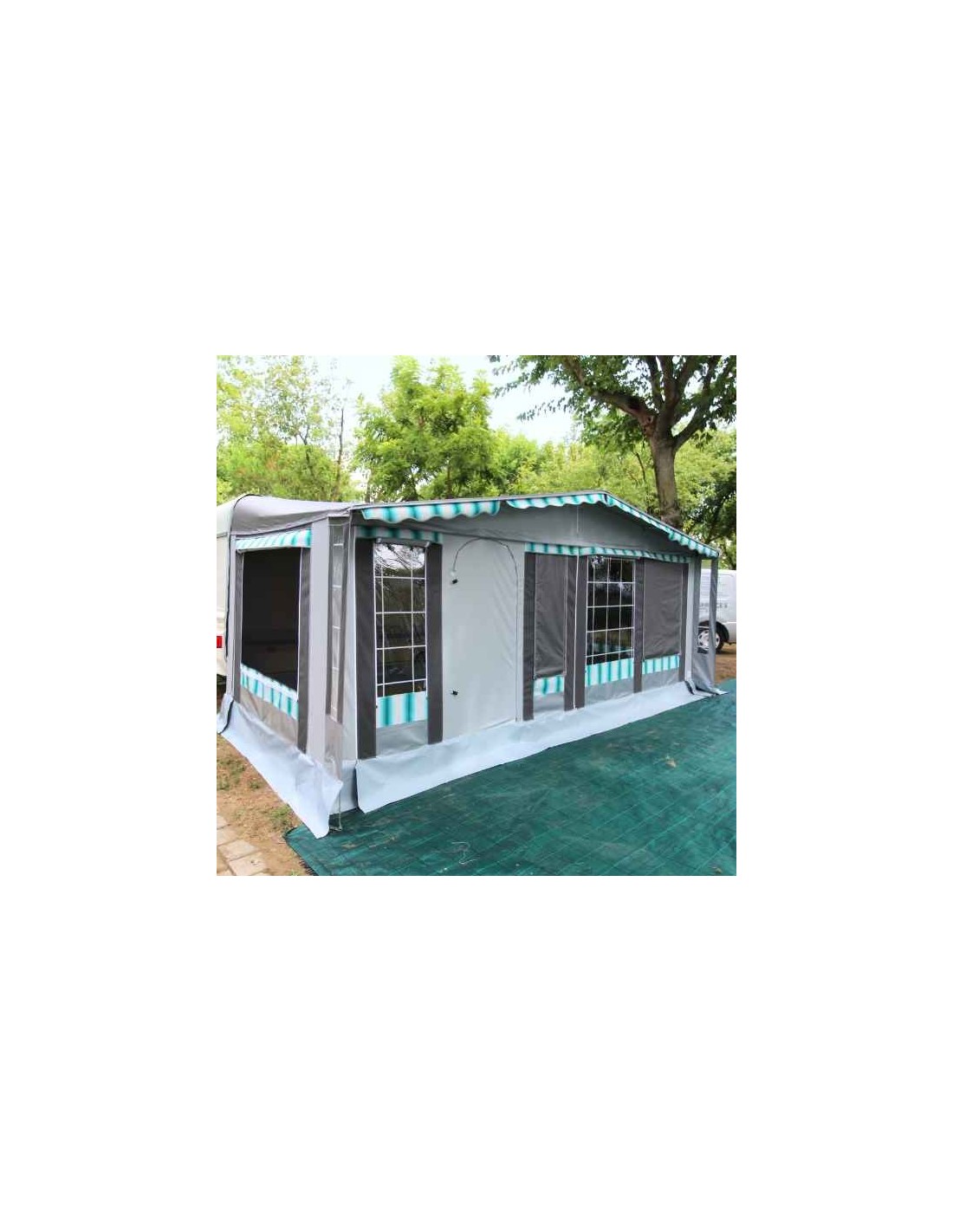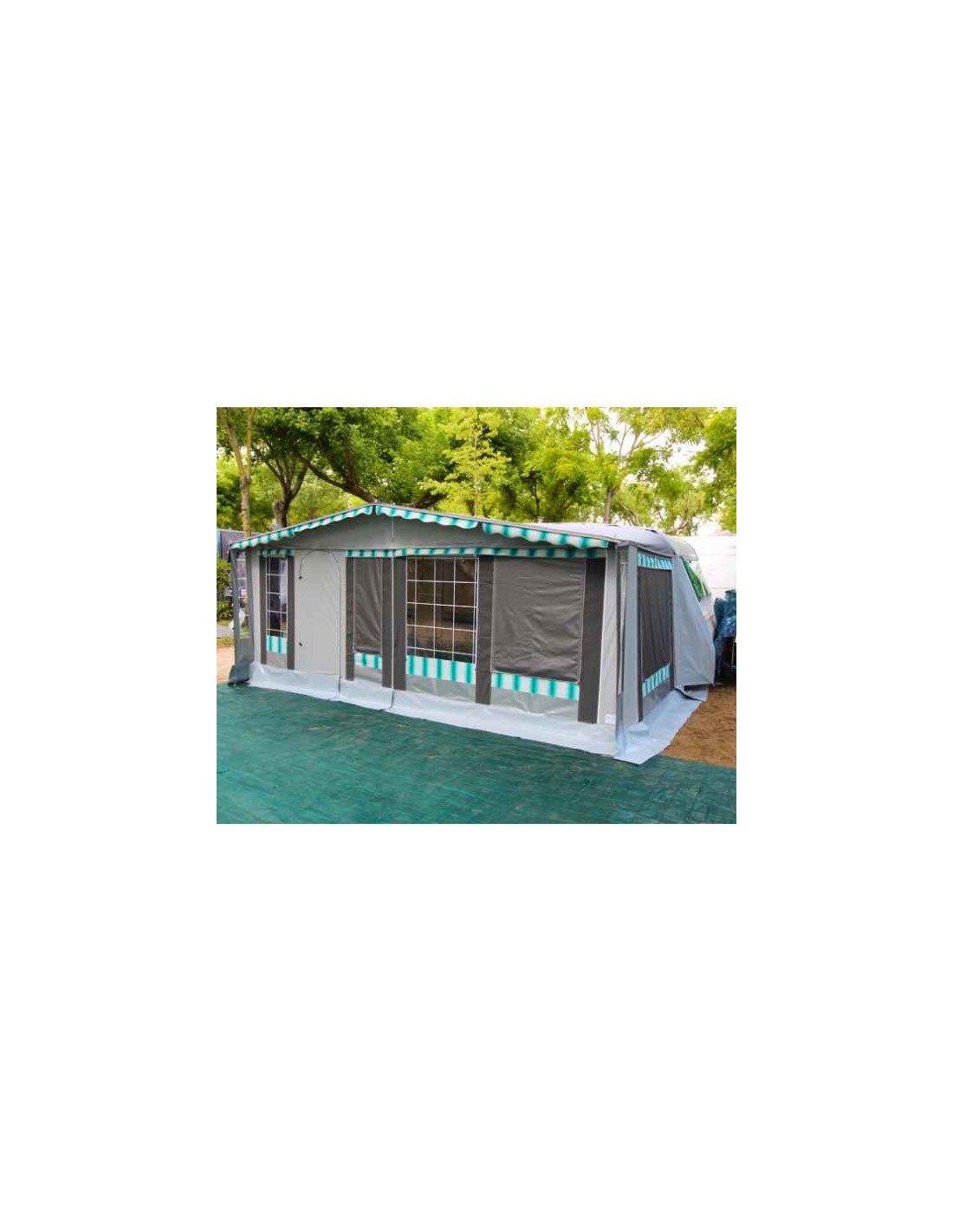 Veranda MIKITEX usata modello ASIA profonda cm 250. Veranda per roulotte molto bella e tenuta molto bene praticamente in condizioni ottime. Veranda caravan con tetto in tencate, materiale che diminuisce la temperatura interna di 3/4 gradi nei picchi di sole acuto. Veranda da campeggio composta da 4 pareti. Nella parte frontale 2 pannelli intercambiabili, una con 1 porta e 2 finestre con cristal e oscurante e una con 2 finestre composte da cristal e oscurante cosi da creare privacy all'interno della veranda per caravan. Nella parte laterale ci sono 2 pannelli sempre intercambiabili con finestre panoramiche dotate di zanzariera e oscurante. Il tetto in tencate ha già installato un sistema di aggancio dei pali chiamato "SHS" che consente il montaggio con la paleria in alluminio attraverso a dei ganci cosi da evitare la foratura con viti per la caravan. Le pareti sono in dralon e tencate, materiali molto resistenti e antiscolorimento. Veranda roulotte usata della profondità di cm 250 ideale per chi fa campeggio stanziale ed ha bisogno di spazi maggiori. La misura dello sviluppo della veranda è di cm 950/980